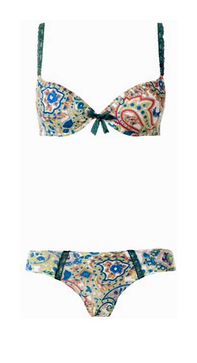 W letniej ofercie Intimissimi znajdziemy szmaragdową, jedwabną koszulkę na cienkich ramiączkach, którą pod biustem ozdabia wstawka z delikatnej koronki. W zielonym zestawie dostępny jest także biustonosz typu push-up oraz stringi i figi. Kolejną gorącą propozycją jest orientalny wzór Paisley, który łącząc geometryczne kształty w kolorach zieleni, niebieskiego i koralu nawiązuje do egzotycznych Indii i charakterystycznych hinduskich ornamentów.
