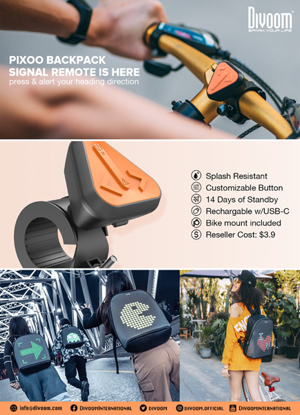 Jeśli jeździsz na rowerze, możesz kupić opcjonalny pilot – Divoom Signal Remote, który możesz dodać do swojego roweru i wyświetlać różne sygnały. Zarówno plecak jak i torba na ramię z serii Pixoo są kompatybilna z naszym pilotem, dzięki czemu zamieni nasza galanteria we wskaźnik ruchu. Możesz także zaprogramować różne obrazy i akcje dla przycisków pilota. Cena urządzenia to 39pln z VAT.